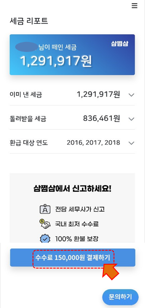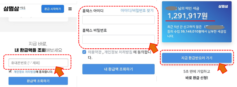 휴대폰 번호를 적고 환급액 조회하기를 클릭하면