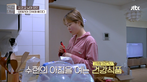 부엌 찻장에서 수프를 꺼내 먹는다.