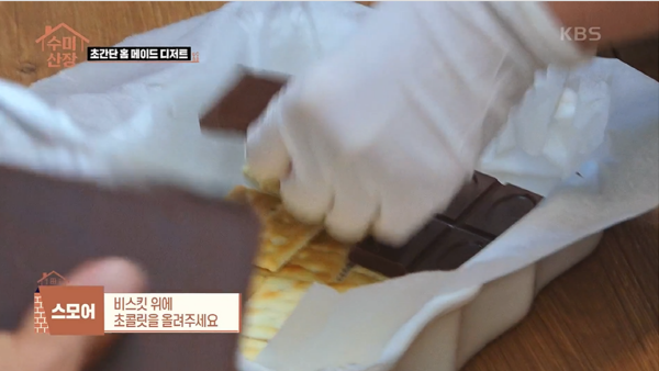 먼저 비스킷을 깔아놓고 초콜릿을 올려준다.